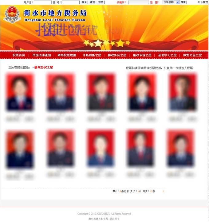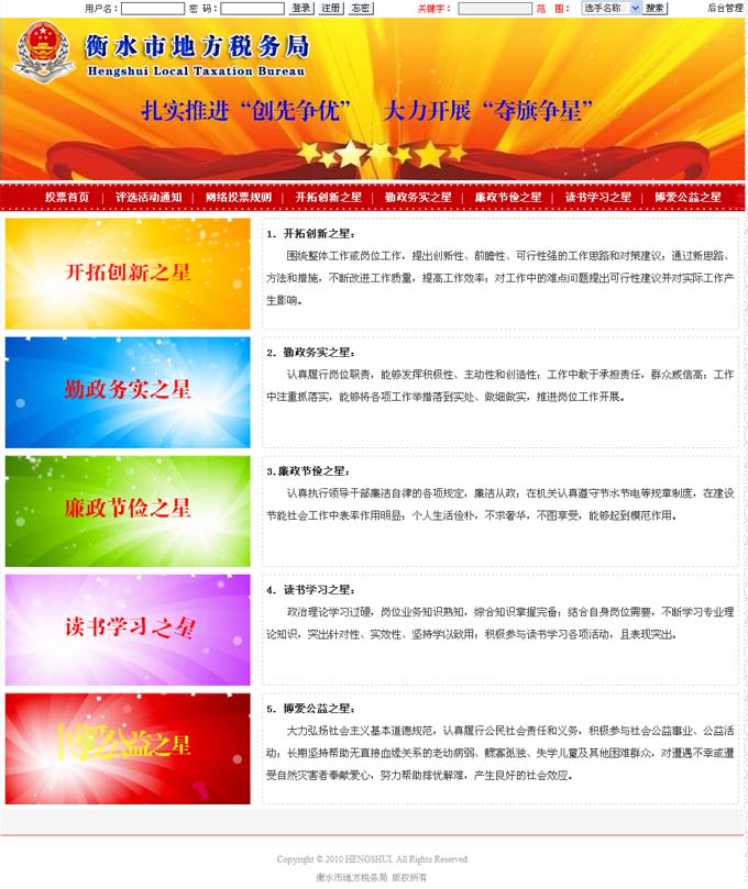 衡水起航網(wǎng)絡(luò)科技有限公司承接了此次人物評選投票活動的網(wǎng)絡(luò)投票程序任務(wù)。經(jīng)過三個日夜的緊張測試,網(wǎng)絡(luò)投票系統(tǒng)已在地稅局內(nèi)網(wǎng)正式上線,投票將于18日上午9:00開始,此次“季度之星”評選共設(shè)置“開拓創(chuàng)新之星”、“勤政務(wù)實(shí)之星”、“廉政節(jié)儉之星”、“讀書學(xué)習(xí)之星”、“博愛公益之星”五個類別,每個類別最終產(chǎn)生“季度之星”1名。