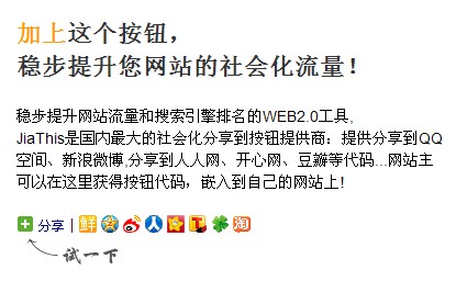 JiaThis是國內(nèi)最大的社會化分享到按鈕提供商:提供分享到QQ空間、新浪微博,分享到人人網(wǎng)、開心網(wǎng)、豆瓣等代碼...網(wǎng)站主可以在這里獲得按鈕代碼,嵌入到自己的網(wǎng)站上!